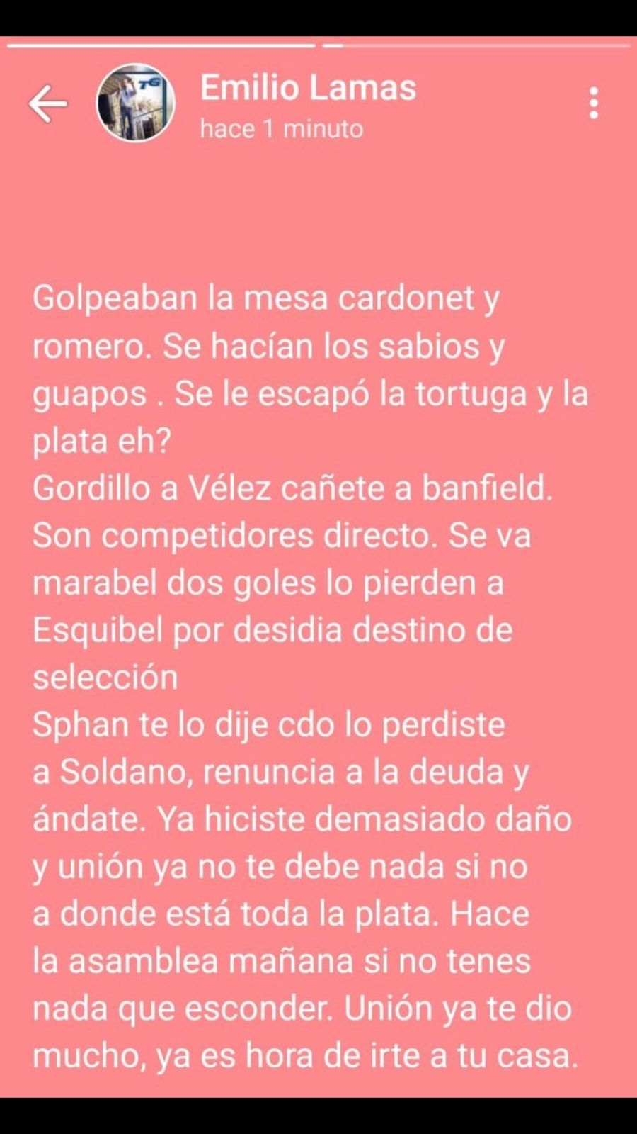 "Golpeaban la mesa Cardonet y Romero. Se hacían los sabios y guapos. Se les escapó la tortuga y la plata, eh? Gordillo a Vélez, Cañete a Banfield. Son competidores directos. Se va Marabel, dos goles, lo pierden a Esquivel por desidia, destino de selección. Spahn te lo dije cuando lo perdiste a Soldano, renunciá a la deuda y andate. Ya hiciste demasiado daño y Unión ya no te debe nada si no a dónde está toda la plata. Hace la asamblea mañana si no tenés nada que esconder. Unión ya te dio mucho, ya es hora de irte a tu casa", agregó el exvice de Unión, en una polémica exposición.