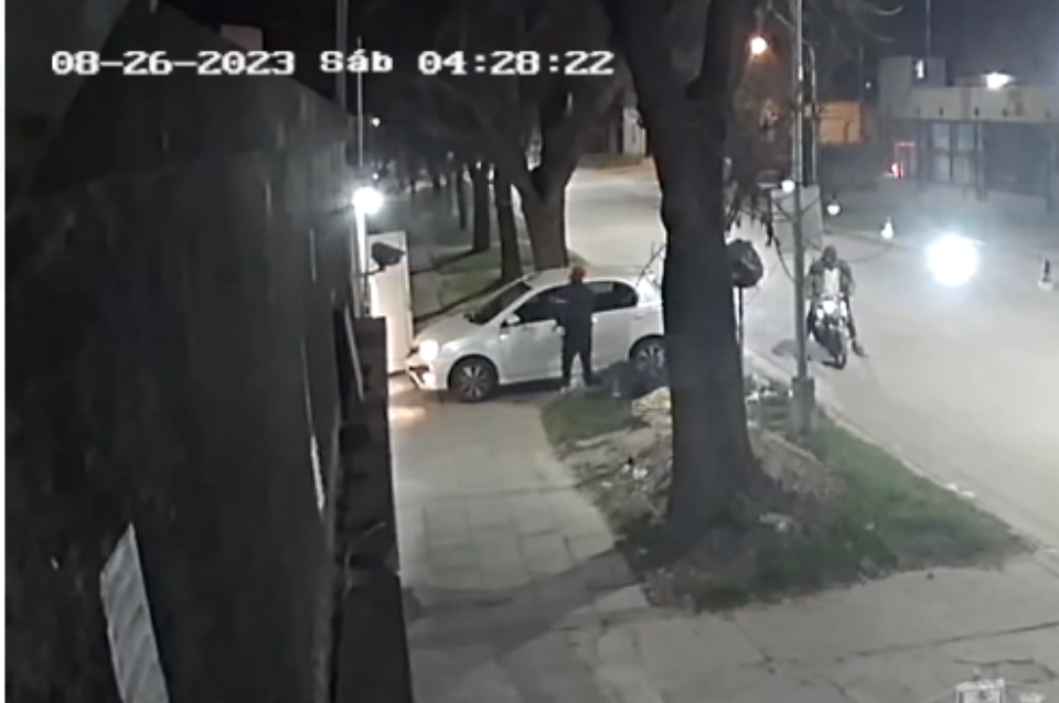 Los ladrones llegaron en una moto y atacaron desde atrás al dueño del auto que, rápidamente logró trabar la puerta del vehículo, ponerlo en marcha y escapar atropellando al que había quedado arriba de la moto. En medio de esto, según aparece en el video, uno de los delincuentes parece gatillar su arma.