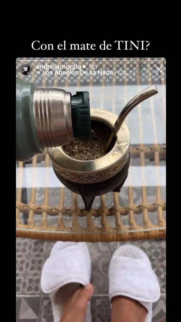 “¿Con el mate de Tini?”, escribió Estefi junto a una captura de la story que originalmente es un video de André, y que cuenta con la conocida canción Costumbres Argentinas, un clásico de Los abuelos de la nada.