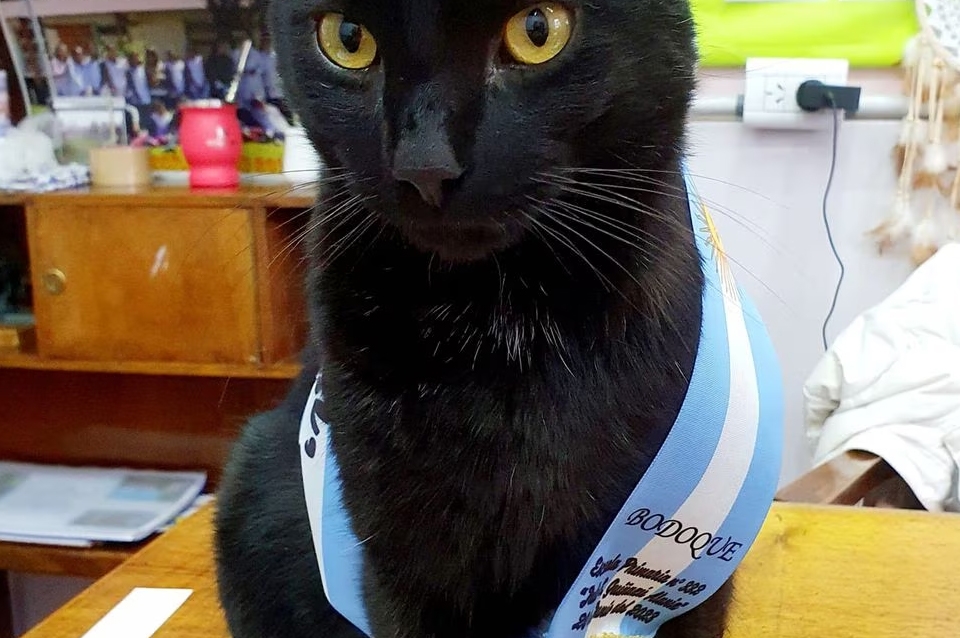Es normal ver abanderados en una escuela, pero lo que no lo es, es que haya gatos abanderados. Este es el caso de Bodoque, un hermoso gatito negro que acompaña todos los días a los alumnos de una escuela de Neuquén, más precisamente de Las Lajas, y se volvió viral por sus fotos con la banda argentina.