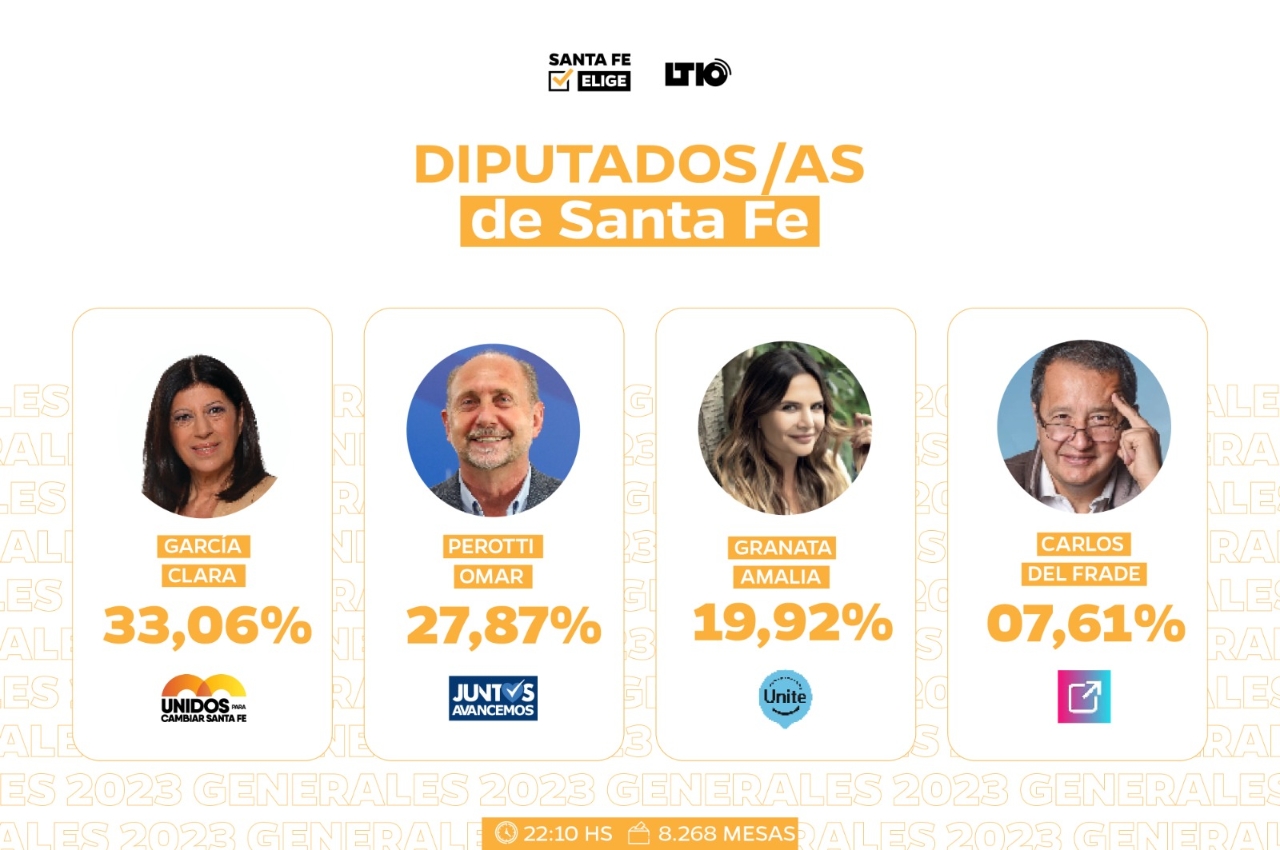 Con los resultados informados hasta las 22 horas, la lista de Clara García obtenía el 33,14% de los votos, más lejos con el 28,03 quedaba el gobernador Omar Perotti, seguido de Amalia Granata que obtiene el 19,93%.