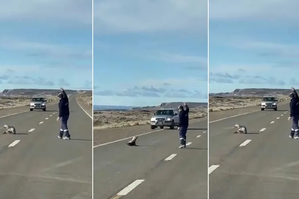 El improvisado rescate ocurrió en este viernes al mediodía en la ciudad de Comodoro Rivadavia y fue capturado por el usuario @anennhuber: "En viaje Comodoro a Caleta Olivia en ruta 3 pude ser testigo de ese héroe sin capa que salvo al pequeño lobito perdido", señaló en Twitter.