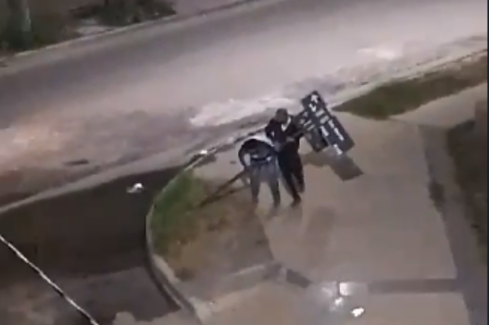 Dos hombres arrancaron un cartel de #señalética de calles.