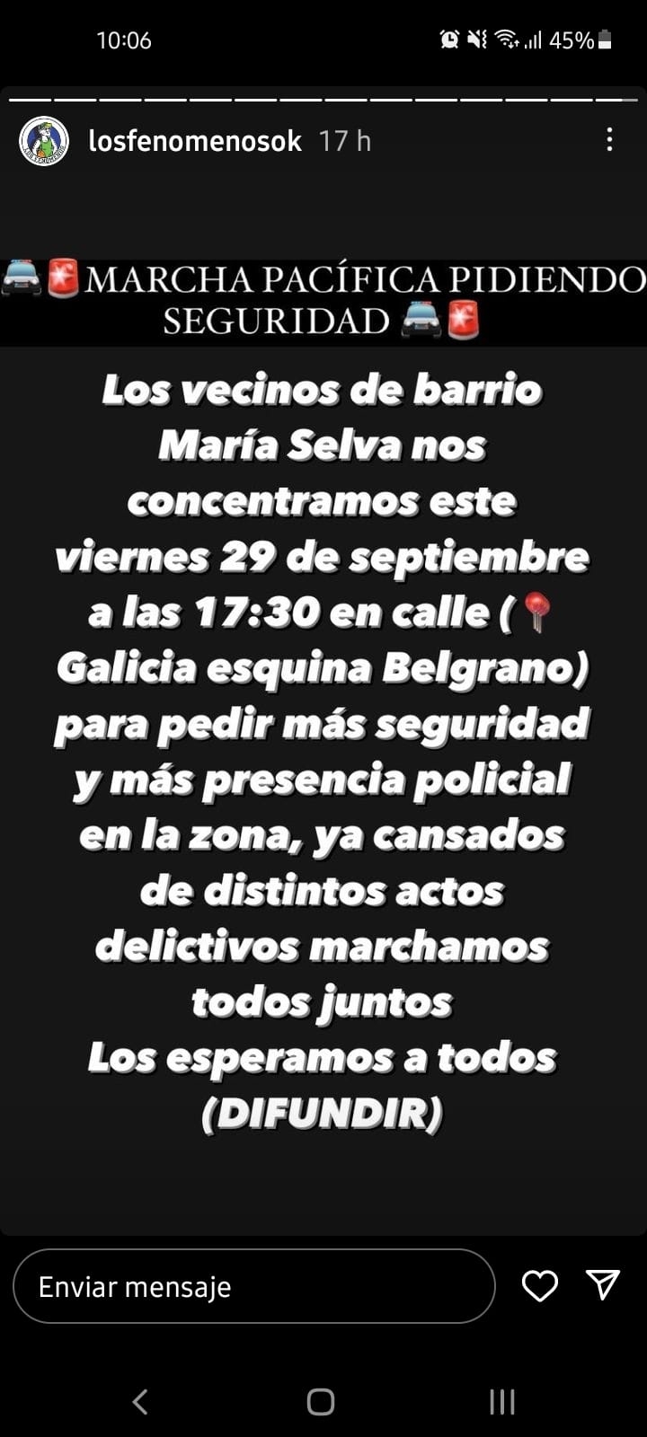 En la misma línea, vecinos autoconvocados de María Selva anunciaron por redes una concentración para la tarde de este viernes.