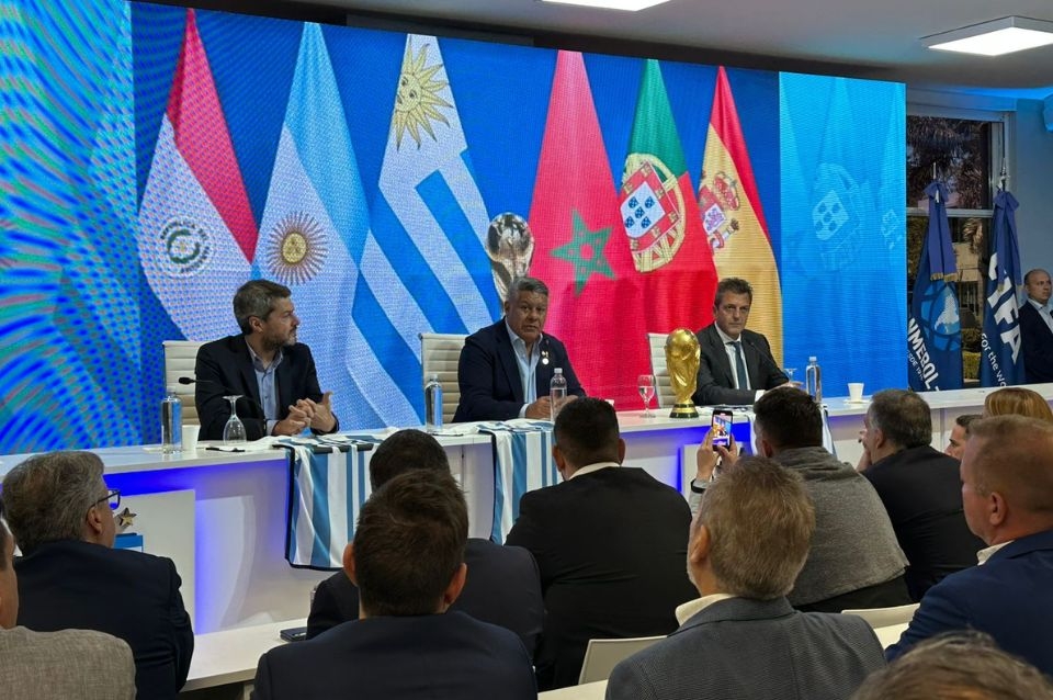 El presidente de la AFA, Claudio Tapia, junto a los ministros de Economía, Sergio Massa, y de Turismo y Deportes, Matías Lammens, presentaron este jueves oficialmente a la Argentina como sede del Mundial 2030 "a costo cero" y "en democracia".