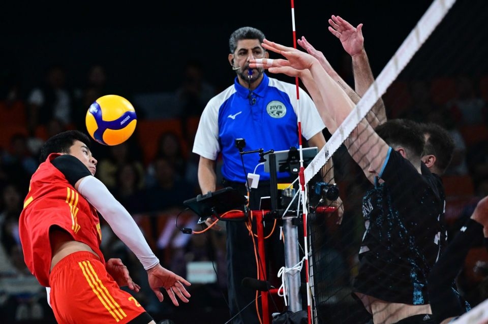 Argentina se impuso con parciales de 22-25, 25-22, 25-19, 20-25 y 15-12, con 22 puntos de Pablo Kukartsev y otros 22 de Luciano Vicentín, máximos anotadores nacionales. El chino C Jiang fue el goleador del partido con 23.