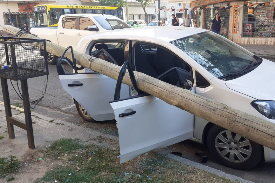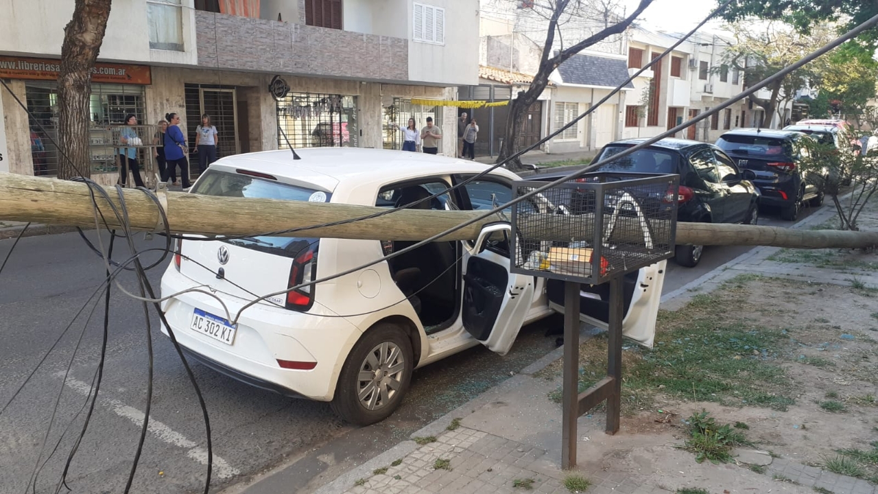 En horas de la tarde de este lunes, una mujer bajaba con su hija del auto, cuando fue advertida por un vecino sobre un poste de luz que estaba apunto de caer sobre ellas. El aviso les permitió escapar, pero no les dió tiempo de cerrar las puertas del auto que quedaron completamente destruidas por la columna de madera.