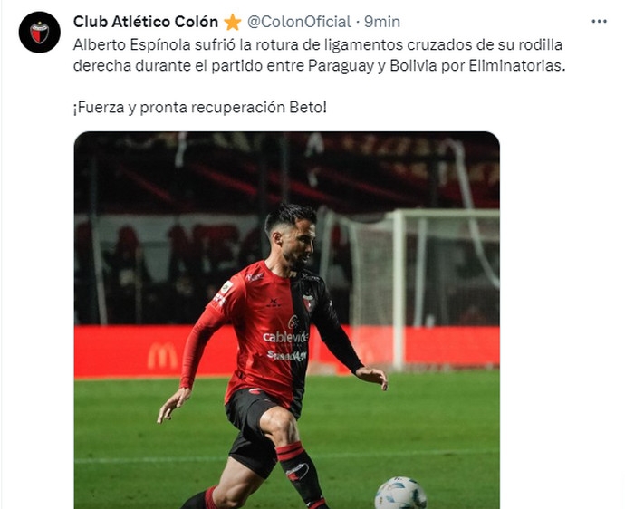 Y Colón, en sus redes sociales, oficializó: "Alberto Espínola sufrió la rotura de ligamentos cruzados de su rodilla derecha durante el partido entre Paraguay y Bolivia por Eliminatorias. ¡Fuerza y pronta recuperación Beto!".