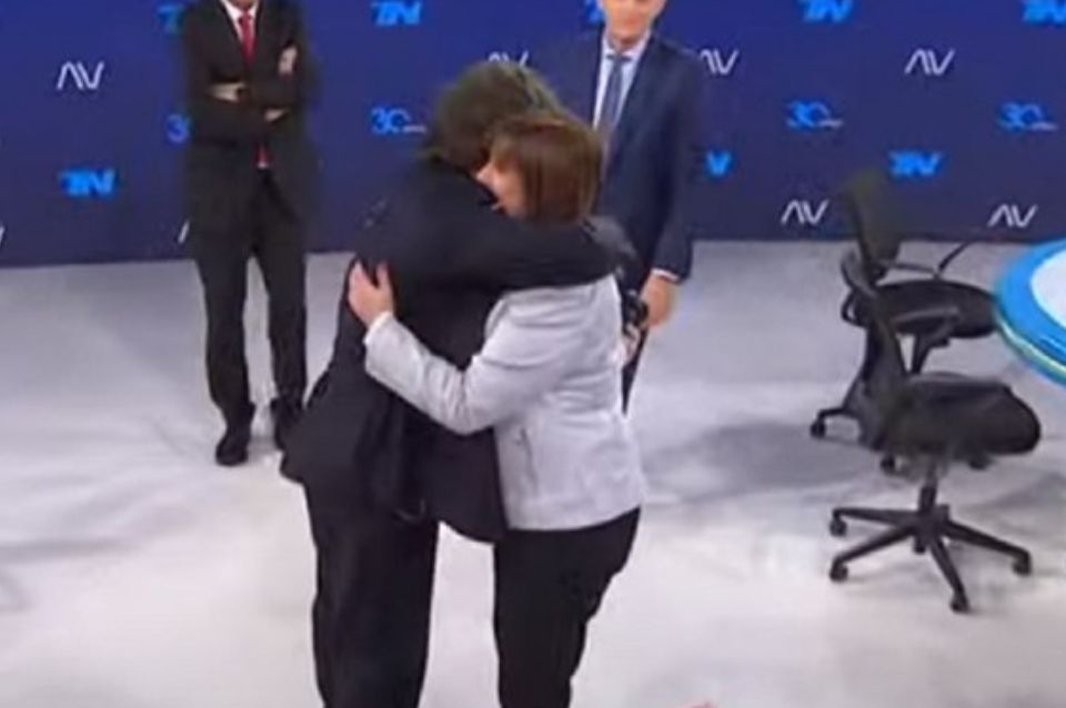 El abrazo entre ambos se dio luego que los conductores de A Dos Voces (TN) se lo pidieran. Es la primera vez que se muestran en público, tras el anuncio de Bullrich este miércoles en el que demostró su apoyo al liberal tras compartir una cena el martes con él y con Mauricio Macri.