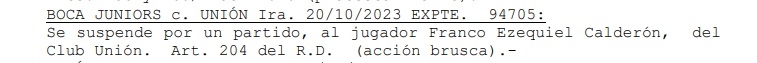 Al ser roja directa y ante Boca tuvo su impacto. Si bien es cierto que hay posturas divididas en torno a si estuvo bien expulsado o no, el informe del árbitro Yael Falcón Pérez fue fuerte, con el argumento de "acción brusca". Había rumores que podían a llegar a darle tres jornadas, pero habría sido clave la defensa de Unión, además del descargo del jugador.