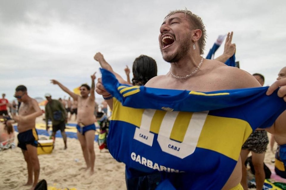 En un clima de fiesta futbolera y a la vez de alta tensión, miles de fanáticos colmaron durante la mañana y el mediodía un sector de la playa en Río de Janeiro, en una movilización sin precedentes para la final de la Copa Libertadores