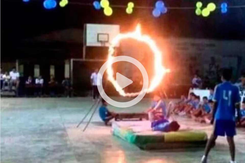 En una muestra artística escolar hicieron saltar un aro de fuego a nenes de 4to grado. Uno tropezó y se prendió fuego. Escuchá los gritos de sus compañeros… Fue en Santiago del Estero, en la localidad de Monte Quemado.