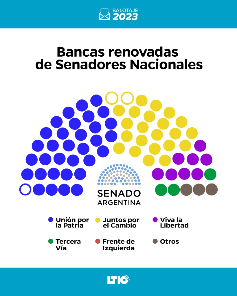 En tanto, en la cámara alta, de 72 que la conforman, Juntos por el Cambio logró retener 24 de las 33 que tenía, mientras que Unidos por la Patria pasó a ser mayoría con 32 bancas. Por otro lado, La Libertad Avanza tendrá su presencia garantizada con ocho legisladores.