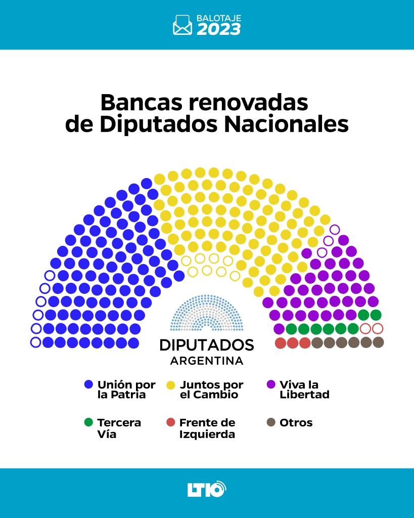 En el caso de diputados, tras el balotaje, la fuerza que resulte ganadora impulsará el nombre de quién presidirá la Cámara baja, persona que se ubica cuarta en la línea sucesoria. En el caso de ser Unión por la Patria, este espacio será la primera minoría. Ahora, en el caso de La Libertad Avanza, corre en desventaja numérica.