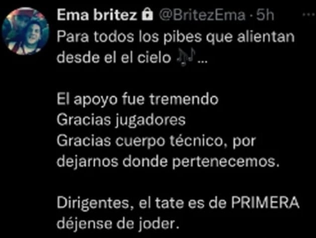 "Para todos los pibes que alientan desde el cielo… El apoyo fue tremendo. Gracias jugadores. Gracias cuerpo técnico, por dejarnos donde pertenecemos. Dirigentes, el tate es de PRIMERA, déjense de joder", escribió en su cuenta de X.