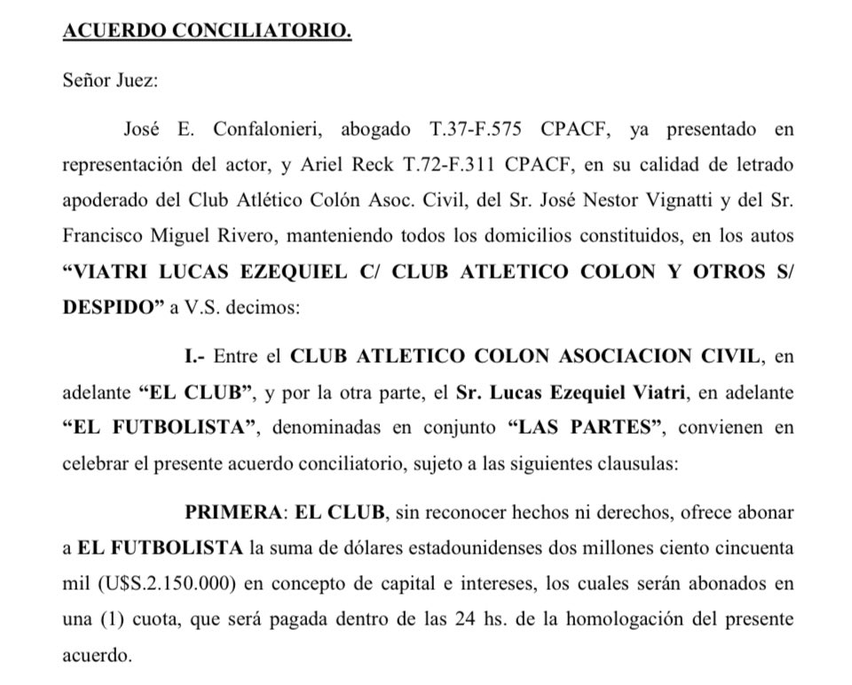 Antes de cerrar su ciclo al frente de Colón, el presidente José Vignatti confirmó en la pasada Asamblea donde se aprobó la Memoria y Balance, con un superávit de más de 40.000.000 de pesos, que se habían pagado los juicios de Lucas Viatri y el uruguayo Rafael García.