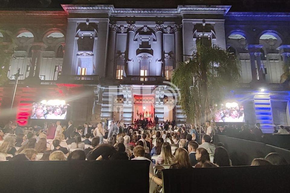 Tras esta instancia, en la explanada del edificio, luego de entonar el Himno Nacional, tomó juramento a los ministros de su gabinete y secretarios.