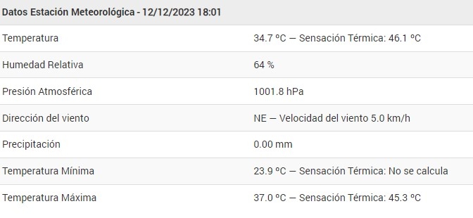 A las 18, el Centro de Informaciones Meteorológicas de la FICH-UNL registró 46,1°C de térmica, siendo la temperatura de 37°, la humedad del 64% y la presión de 1001.80 hPa.