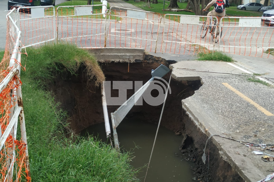 En la esquina de calle Pedro Vittori y Luciano Molinas, hace poco más de un mes, se produjo un gran socavón en plena ciclovía. Las lluvias de este miércoles profundizaron el problema, el socavón se agrandó, tragándose también un poste de iluminación.