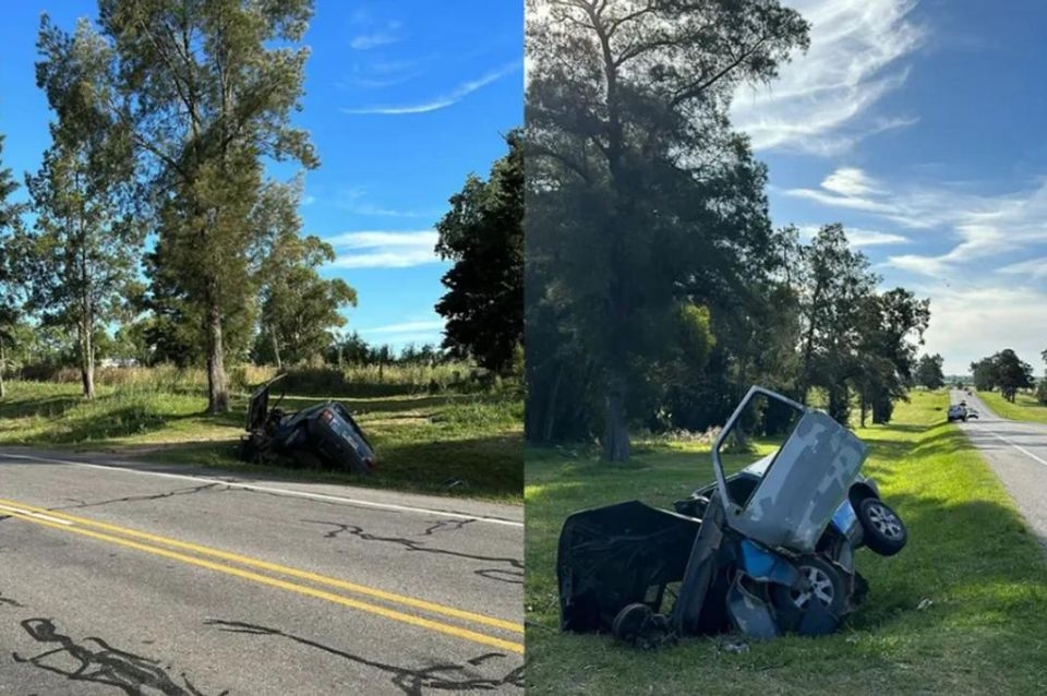 El auto de color azul grisáceo y de patente uruguaya quedó en la banquina, totalmente destrozado. Según se ve en las imágenes difundidas, las ruedas quedaron fuera de eje, la puerta del conductor abierta, el techo colapsó y parte del motor quedó en el pasto, entre algunos de los tantos daños que sufrió.