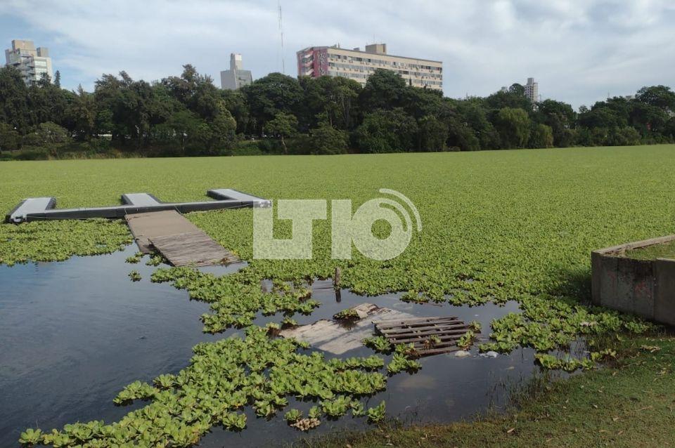 El lago del Parque Sur sigue siendo un terreno verde ganado por los repollitos de agua que no paran de reproducirse, pese al trabajo de empleados municipales que intentan sacarlos.