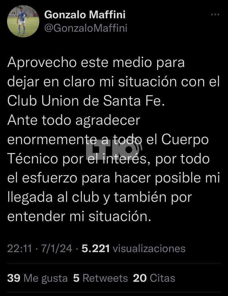Maffini utilizó su cuenta de X, para referirse a su salida y comenzó escribiendo: "Aprovecho este medio para dejar en claro mi situación con el Club Unión de Santa Fe. Ante todo agradecer enormemente a todo el Cuerpo Técnico por el interés, por todo el esfuerzo para hacer posible mi llegada al club y también por entender mi situación".