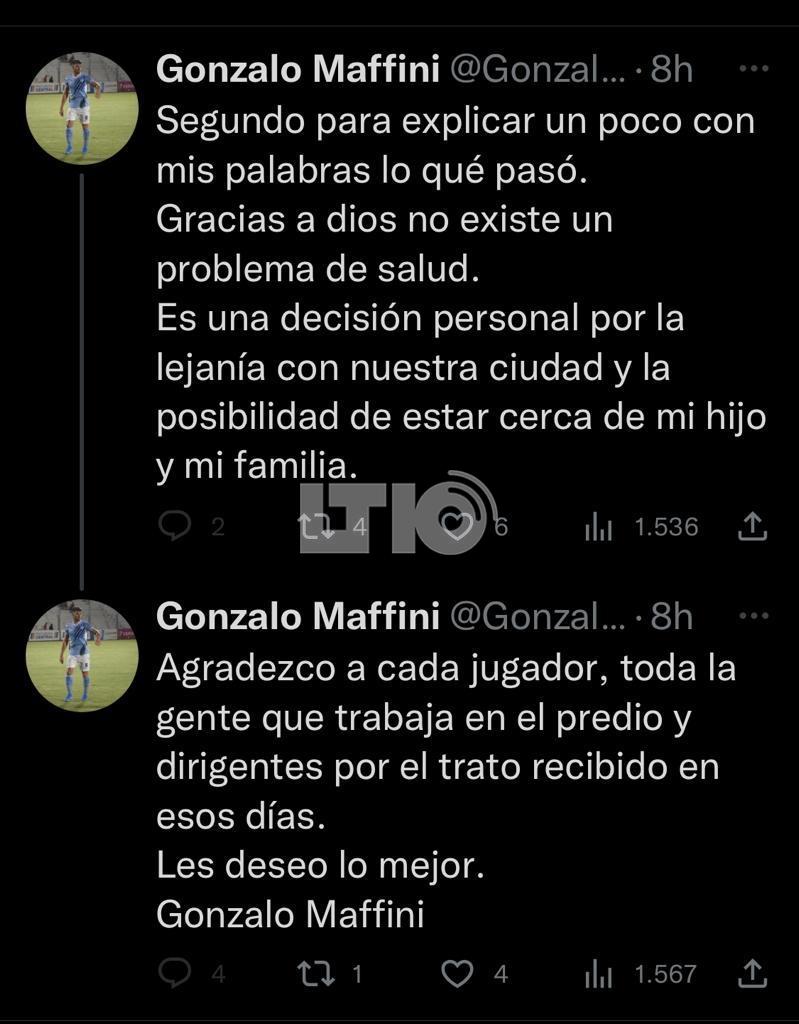 Para cerrar, la última publicación antes de borrar su cuenta, fue la siguiente "Agradezco a cada jugador, toda la gente que trabaja en el predio y dirigentes por el trato recibido en estos días. Les deseo lo mejor. Gonzalo Maffini".