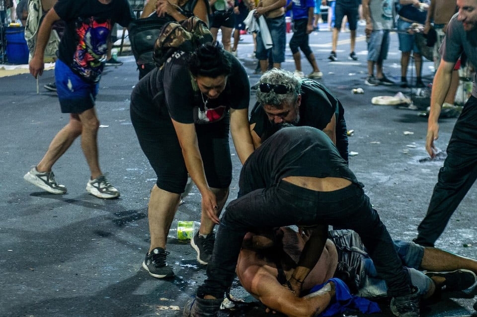 En las afueras del estadio hubo corridas y algunos enfrentamientos entre la policía y los fans. En ese contexto, un personal de seguridad golpeó a un individuo y lo dejó tendido en el suelo sin reaccionar. Las imágenes captadas fueron subidas a las redes y se viralizaron rápidamente.