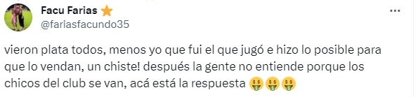 Un fuerte dolor de cabeza para evitar embargos e inhibiciones. Sobre todo, sin plata ahora para hacerlo. La noticia se hizo viral y el propio Farías hizo su descargo en las redes sociales: "Vieron plata todos, menos yo que fui el que jugó e hizo lo posible para que lo vendan, un chiste! después la gente no entiende porque los chicos del club se van, acá está la respuesta".