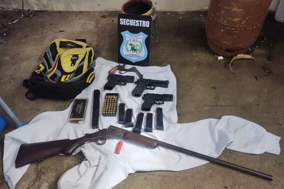 De la casa secuestraron tres pistolas, un revolver y una escopeta, motivo por el que fue detenido uno de los hijos por abuso de armas.