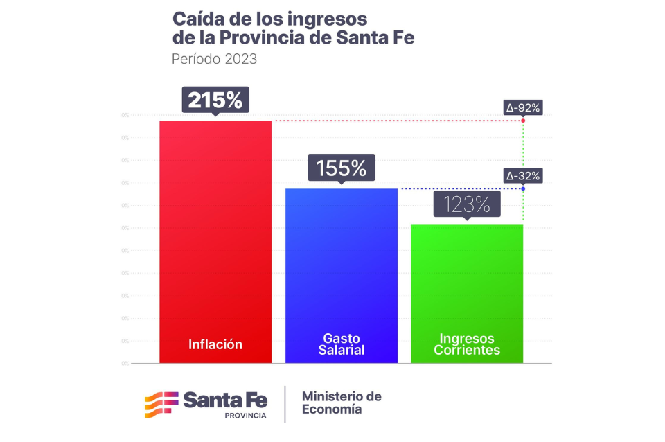 Durante este miércoles, el Ministro de Economía Pablo Olivares, presentó un informe en el que da cvuenta que durante 2023, los ingresos corrientes en la Provincia se ubicaron en el orden del 123 % respecto a 2022, mientras que la inflación fue del 215, 4 %, y el gasto salarial provincial creció un 155 %.