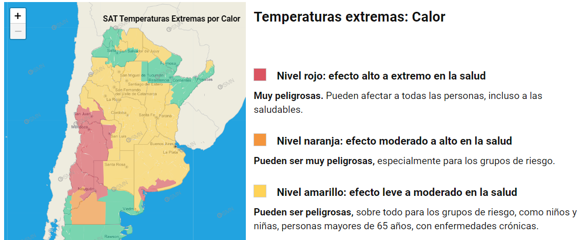 El Servicio Meteorológico Nacional emitió un alerta por temperaturas extremas amarilla para toda la provincia. Según la misma, las temperaturas "pueden ser peligrosas, sobre todo para los grupos de riesgo, como niños y niñas, personas mayores de 65 años, con enfermedades crónicas".