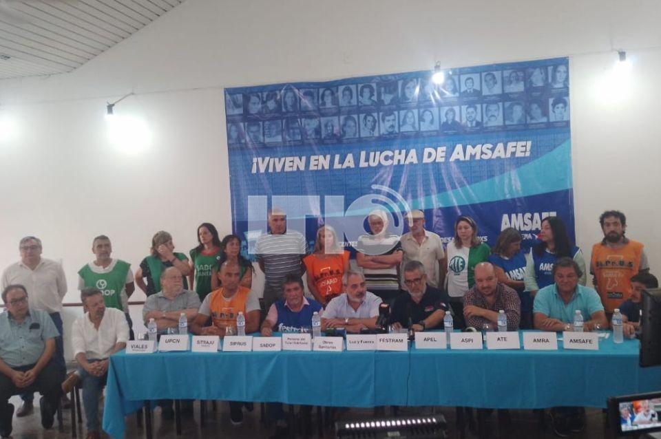 Este martes por la mañana, en Amsafe, se reunieron varios gremios estatales para firmar una declaración conjunta contra le decisión del gobierno provincial de pagar un 14% de aumento correspondiente a la deuda por el cierre de la paritaria 2023.