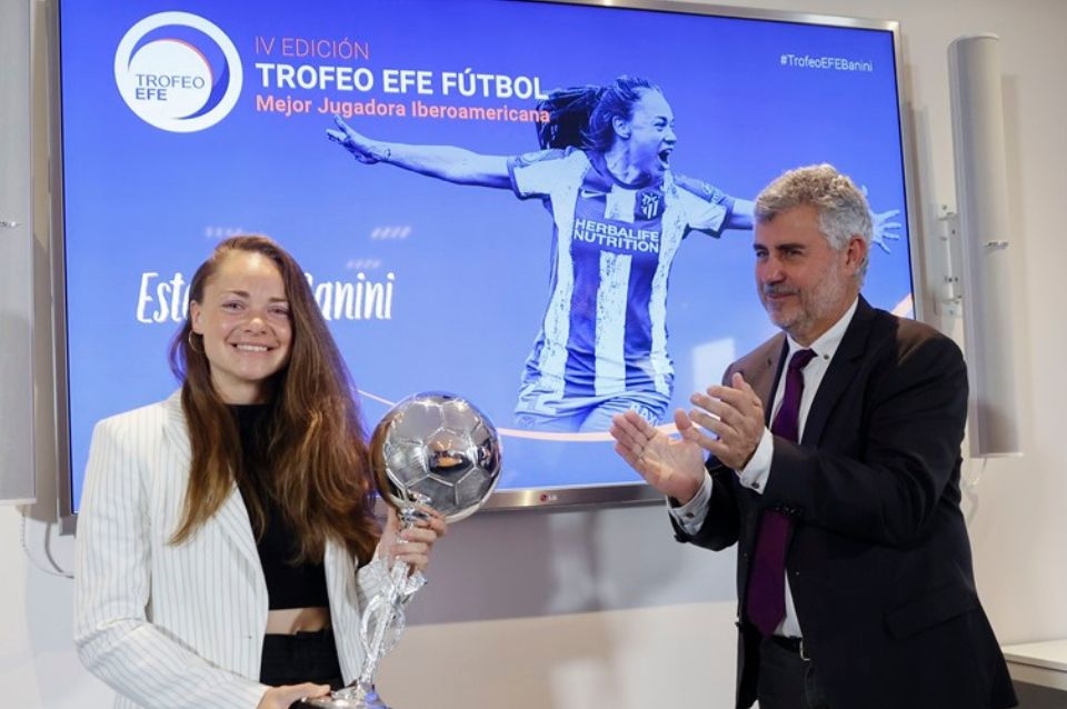 La futbolista argentina Estefanía Banini, mediocampista del Atlético de Madrid, fue distinguida hoy con el premio EFE a la mejor Jugadora Iberoamericana del 2023.