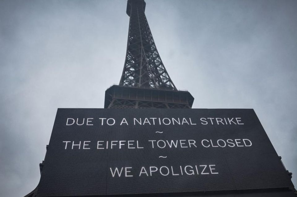 Este lunes, la torre situada en el centro de París amaneció con un cartel destinado a los miles de turistas que rezaba: "Debido a una huelga, la Torre Eiffel está cerrada. Pedimos disculpas". La misma información se reproduce en la página oficial del sitio, donde también se disculpan "por las molestias causadas".