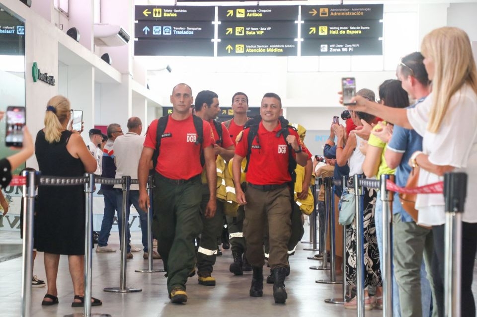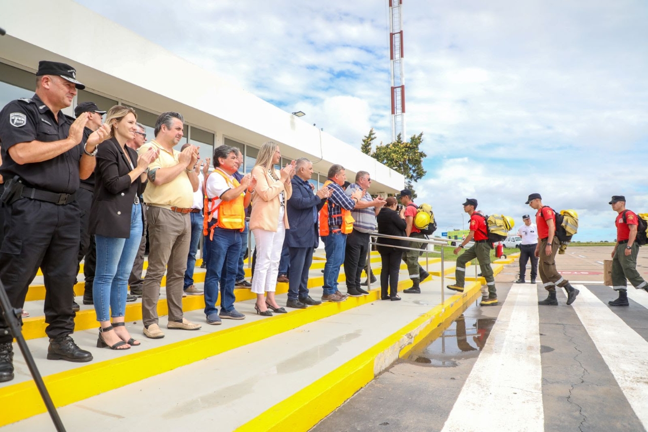 Los brigadistas fueron recibidos por ministro de Justicia y Seguridad, Pablo Cococcioni; el secretario de Protección Civil y Gestión de Riesgos Marcos Escajadillo, y la secretaria de Gestión Institucional, Virginia Coudannes; entre otros funcionarios provinciales.