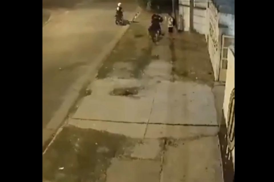 El momento quedó grabado por las cámaras de seguridad de la zona. En las imágenes se ve cómo dos chicos salen del Club Oriental hasta que fueron abordados por dos motochorros encapuchados.
