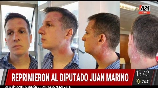 El diputado de Unión por la Patria Juan Marino participó de la movilización de Ctera al Congreso de la Nación y fue reprimido con gas pimienta por parte de la Policía de la Ciudad de Buenos Aires.