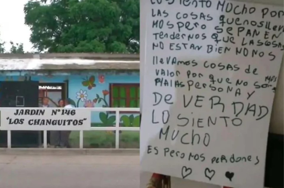Una banda de delincuentes que robó en un jardín de infantes en Santiago del Estero le dejaron una insólita carta a los directivos de la escuela pidiéndoles perdón por el hecho.