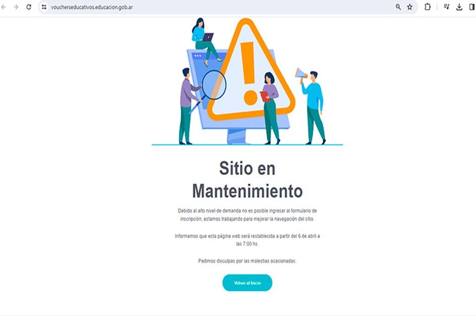 Cuando uno ingresa a la web se anuncia que el sitio está sujeto a tareas de mantenimiento debido al alto nivel de demanda. Debido al alto nivel de demanda no es posible ingresar al formulario de inscripción, estamos trabajando para mejorar la navegación del sitio. Informamos que esta página web será restablecida a partir del 6 de abril a las 7:00 hs. Pedimos disculpas por las molestias ocasionadas., se señala.