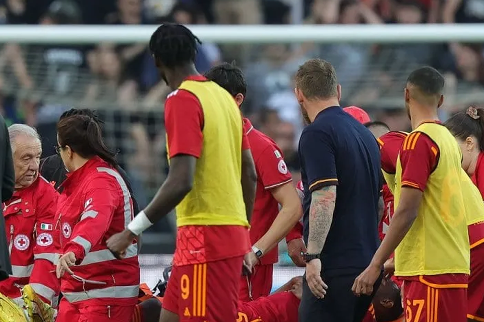 Fue en ese momento cuando De Rossi se negó a continuar el partido sin revisar él mismo el estado de su central. Acudió dentro del vestuario a revisar la condición de Ndicka con el permiso del colegiado, que le dio un permiso de 2 minutos con el juego parado. "Está bien", dijo el técnico cuando volvió al campo, tranquilizando a sus jugadores. Sin embargo, De Rossi, visiblemente afectado y preocupado, pidió al colegiado y al entrenador rival, Daniele Cioffi, suspender el partido por la complejidad de la situación.