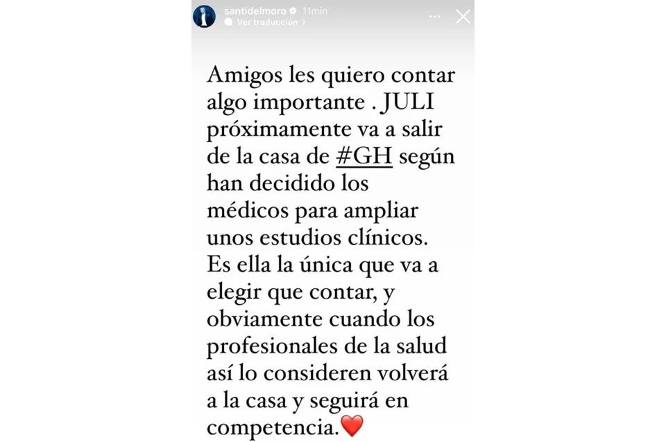 "Amigos, les quiero contar algo importante: Juli próximamente va a salir de la casa de Gran Hermano según han decidido los médicos para ampliar unos estudios clínicos", escribió Del Moro en su cuenta de Instagram, donde tiene más de 4 millones de seguidores.