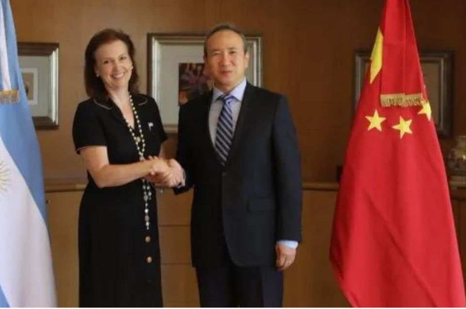 La canciller antes de partir de China se encontró en el aeropuerto internacional de Ezeiza con el embajador asignado al país, Wang Wei.