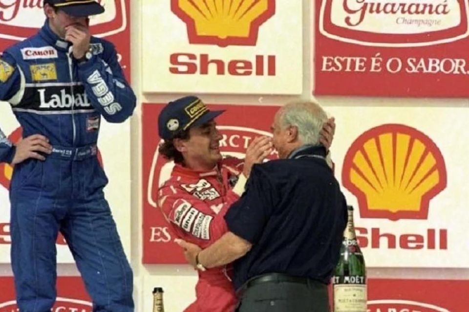 Su última foto juntos se produjo en el Gran Premio de Brasil 1993, en el que Senna logró su segunda victoria en la Fórmula 1 en tierras paulistas, relegando al segundo puesto a Damon Hill y al tercero a Michael Schumacher. Para sorpresa de todos, Fangio se subió al podio para entregarle el trofeo de vencedor a Ayrton y el Chueco le hizo el gesto del “1” con su dedo al brasileño, quien luego se fundió en un cálido abrazo con él.