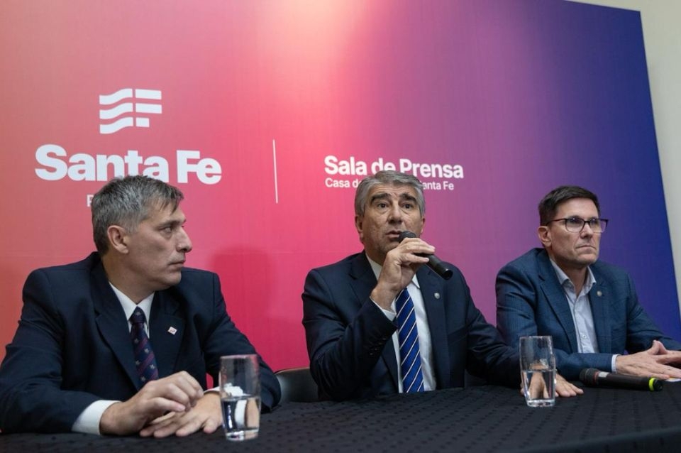 Los ministros de Gobierno e Innovación Pública, Fabián Bastia; de Educación, José Goity; y de Economía, Pablo Olivares, brindaron una conferencia de prensa para referirse al impacto del paro en las escuelas de Santa Fe.