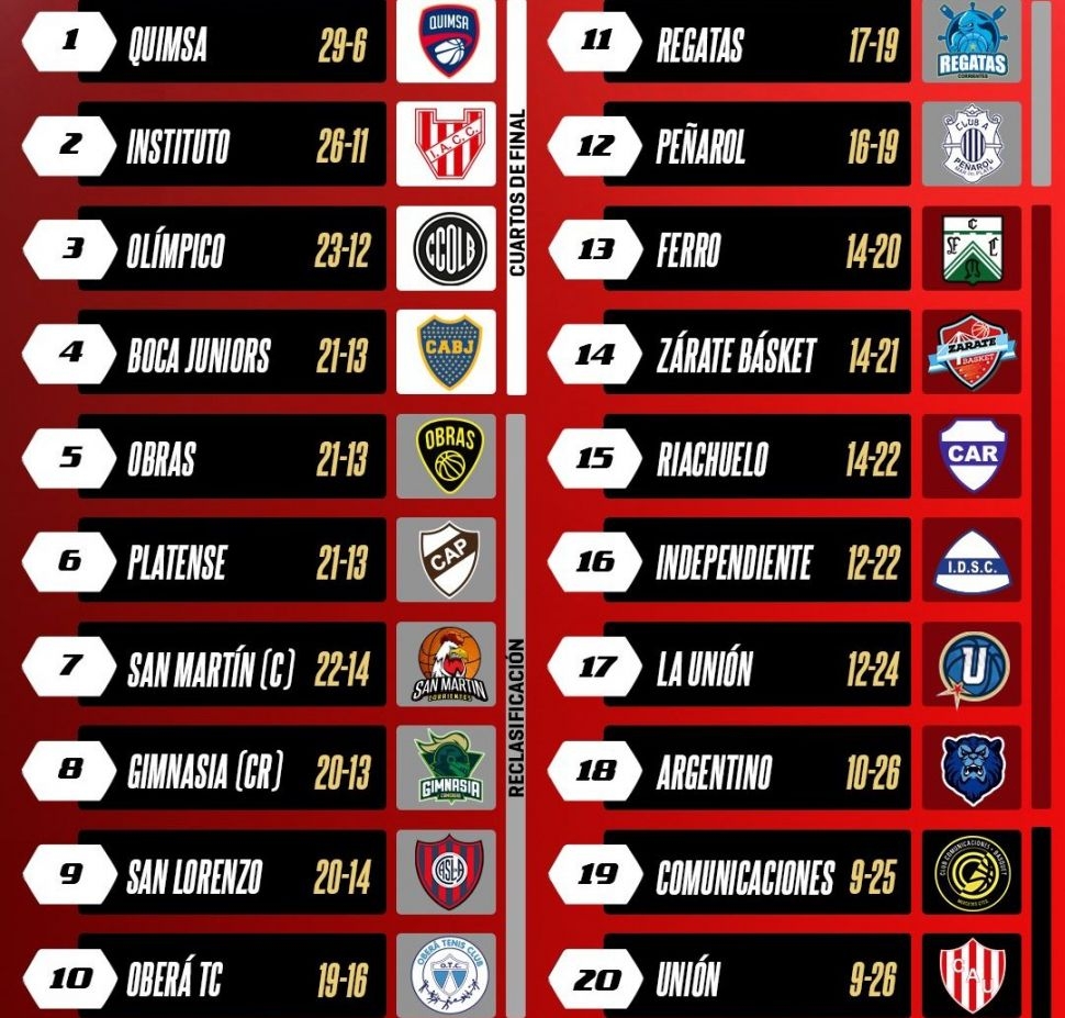 La parte alta solamente tiene a Quimsa con el número 1 ya confirmado. Instituto se mantiene segundo con 26-11 y depende de sí mismo para quedar segundo. En caso de perder, y que Olímpico lo iguale, el bandeño terminará en dicha posición. Ningún otro elenco puede terminar en el podio.