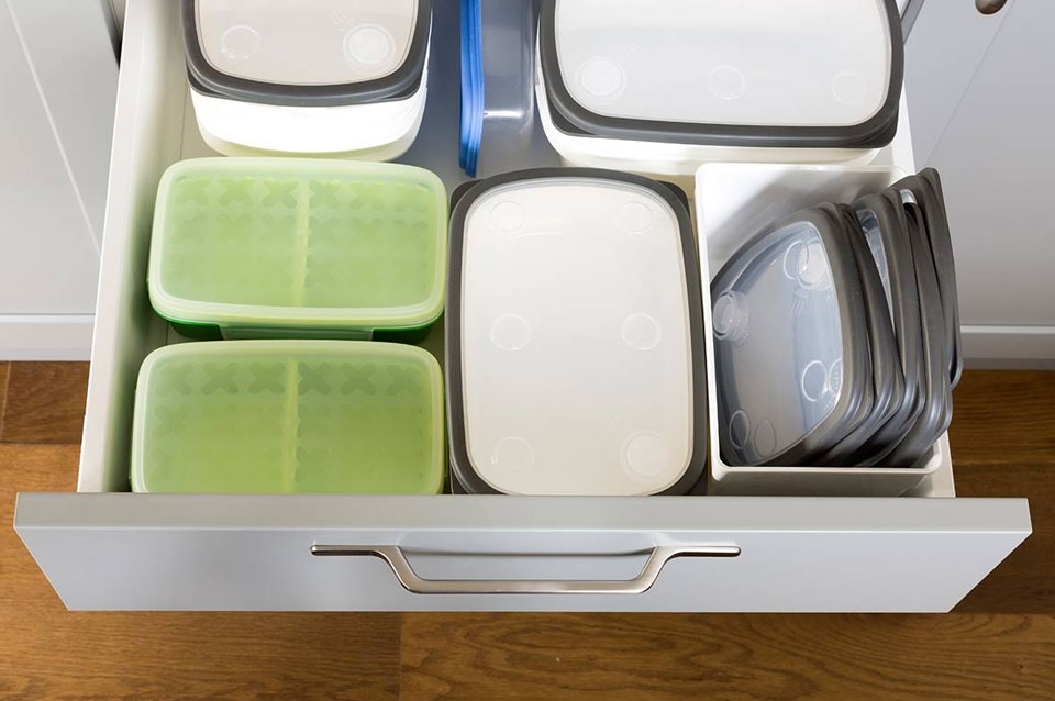 Aprovechá las puertas de los cajones: las podés ocupar para colocar las tapas y dejar todo el cajón para los contenedores de almacenamiento de alimentos, tan solo colocá revisteros pegados a la parte interior de la puerta y listo.