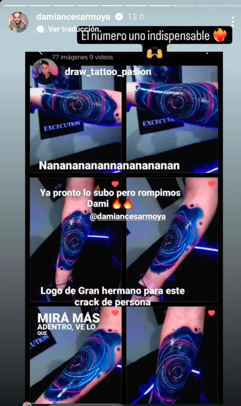 Un mes después de haber abandonado la casa de Gran Hermano, Damián Moya tomó se tatuó en el antebrazo el ojo de Gran Hermano.