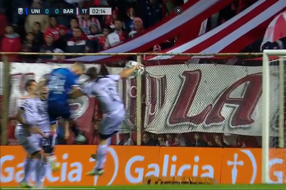 La primera ocurrió al minuto de juego, tras un centro desde la izquierda, cabeceó Pardo para Unión y el defensor Nicolás Capraro saltó a su lado con la mano derecha extendida en forma antinatural y ampliando el volumen del cuerpo. La repetición televisiva verificó el contacto de la pelota con el brazo del futbolista del equipo de Alejandro Orfila, pero pese a que hubo chequeo del VAR no se llamó al juez Nicolás Ramírez a consulta. Era penal para el tate.