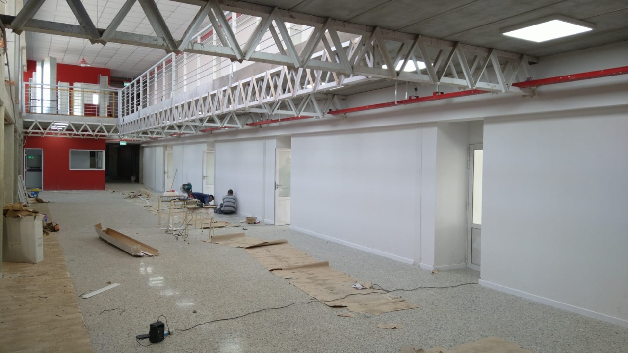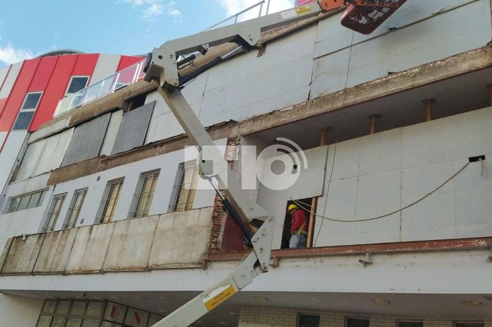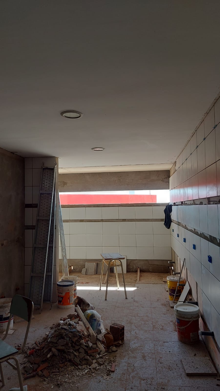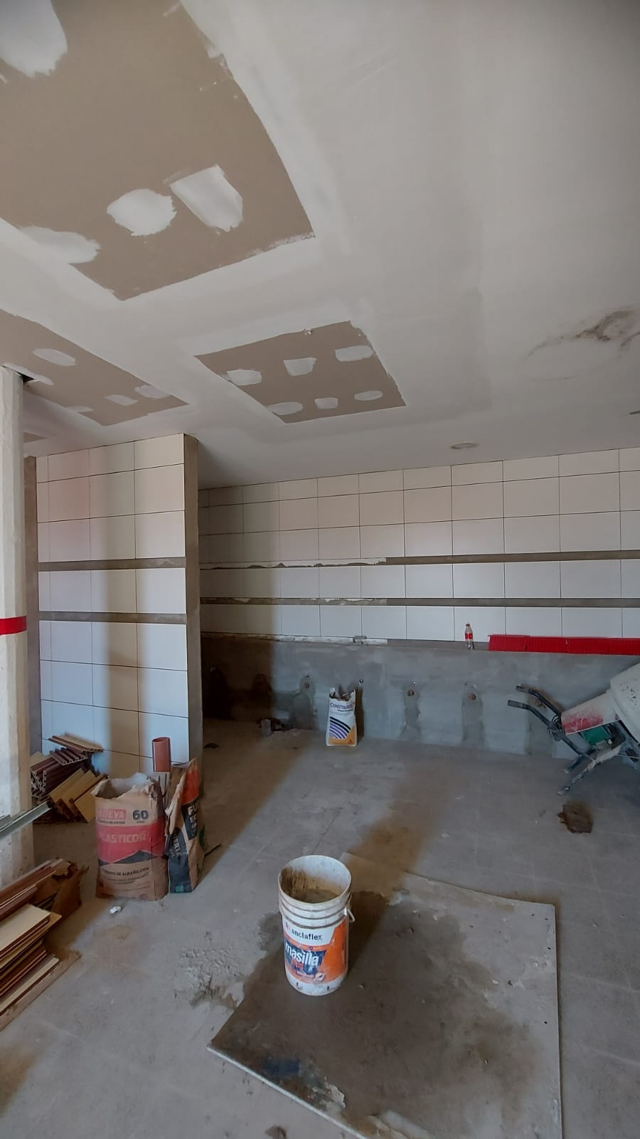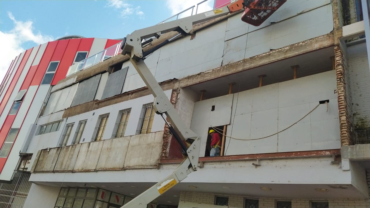 -En el frente se realizó la demolición de muros y corrimientos de cierres de chapa. Se ejecutó mampostería de nivelación y se continúa con revoques de vigas. Todas tareas previas a la instalación de la estructura de piel de vidrio.